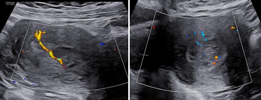 Hình 3: (trái: ngã âm đạo, phải: ngã bụng): Trên Dopple màu, phần tổn thương ở cổ tăng sinh mạch máu độ 4, không ranh giới giữa tổn thương và cơ vùng cổ tử cung