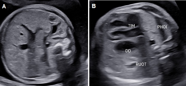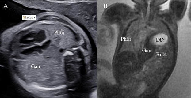 Hình 2. Thoát vị hoành trái. A: Mặt cắt ngang bụng không thấy dạ dày. B: Mặt cắt ngang 4 buồng tim có hình ảnh dạ dày (DD) và ruột đẩy sát tim qua sát thành ngực phải; phổi phải bị chèn ép.