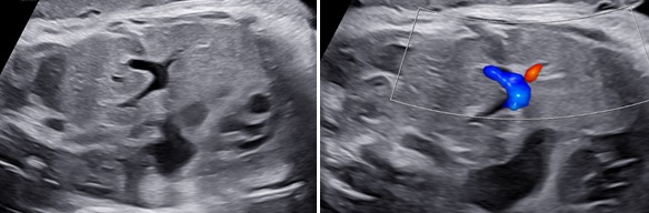 3. Hình ảnh tĩnh mạch rốn đoạn chia nhánh ra tĩnh mạch cửa trái trên Doppler màu trong mặt cắt ngang tại vị trí chu vi bụng cong về phía bên trái gợi ý thoát vị gan