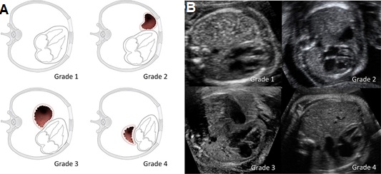 Hình 8. Hình vẽ phác họa (A) và hình ảnh siêu âm (B) của thai nhi có CDH bên trái và vị trí dạ dày khác nhau. Độ 1: Dạ dày không thấy trong lồng ngực. Độ 2: Dạ dày tiếp xúc với thành ngực trước. Độ 3: Dạ dày cạnh van nhĩ thất nhưng vẫn chiếm ưu thế phía trước. Độ 4: Hầu hết dạ dày nằm sau van nhĩ thất.[7]