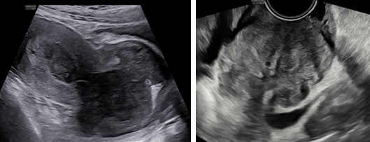 Hình 1: Hình siêu âm 2D ngã bụng (trái) và ngã âm đạo (phải) cho thấy tổn thương từ lòng tử cung lan tới cổ tử cung, không thấy ranh giới của khối này với cơ vùng cổ tử cung