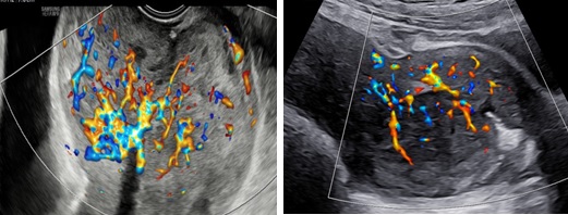 Hình 3: (trái: ngã âm đạo, phải: ngã bụng): Trên Dopple màu, phần tổn thương ở cổ tăng sinh mạch máu độ 4, không ranh giới giữa tổn thương và cơ vùng cổ tử cung