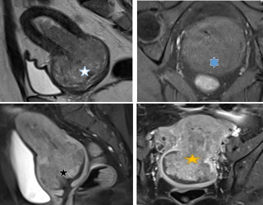 Hình 4: Hình trên trái T2W sagital thấy khối từ lòng tử cung lan xuống cổ tử cung, xâm lấn cơ vùng cổ tử cung. tổn thương có tín hiệu cao nhẹ không đồng nhất trên T2W (ngôi sao trắng). Hình trên phải, T1 FS trên măt cắt ngang thấy tổn thương tín hiệu giống cơ vùng cổ tử cung, không rõ ranh giới giữa tổn thương và cơ vùng cổ tử cung (ngôi sao xanh) . Hình dưới bên trái: sagital T1 FS sau tiêm Gd, tổn thương bắt thuốc tương phản mạnh không đồng nhất (ngôi sao đen). Hinh dưới phải: T1 FS coronal sau tiêm tổn thương bắt thuốc tương phản mạnh không đồng nhất ( ngôi sao vàng)