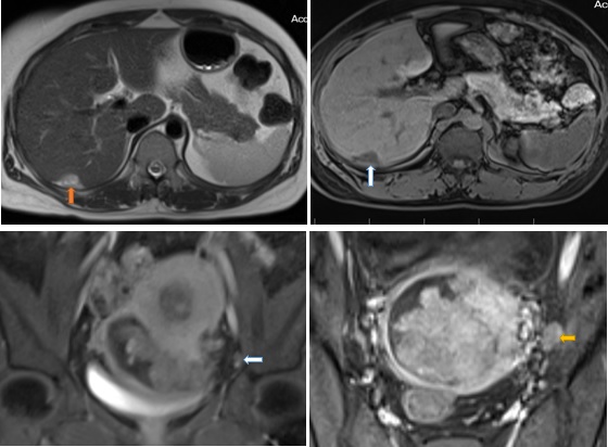 Hình 5: Hình trên trái: nốt reo rắc phúc mạc bờ gan hạ phân thùy VII, tín hiệu cao nhẹ trên T2 ( mũi tên cam); hình trên phải: sau tiêm Gd trên xung T1 vibe FS tổn thương bắt thuốc tương phản kém ( mũi tên trắng) ; Hình dưới trái: Nốt bắt thuốc phúc mạc vùng chậu trên hình T1 vibe FS sau tiêm Gd ( mũi tên trắng); Hình dưới phải: T1 FS Sau tiêm Gd hạch bắt thuốc tương phản không đồng nhất (mũi tên vàng)