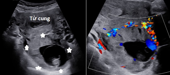 Hình 2: Siêu âm ngã âm đạo cho thấy khối thai nằm sau tử cung, bánh nhau ăn chặt vào cơ tử cung thành sau (hình sao), không có lớp cơ bao quanh khối thai.